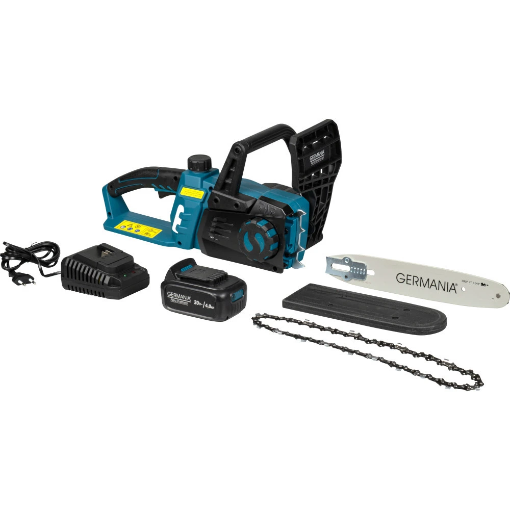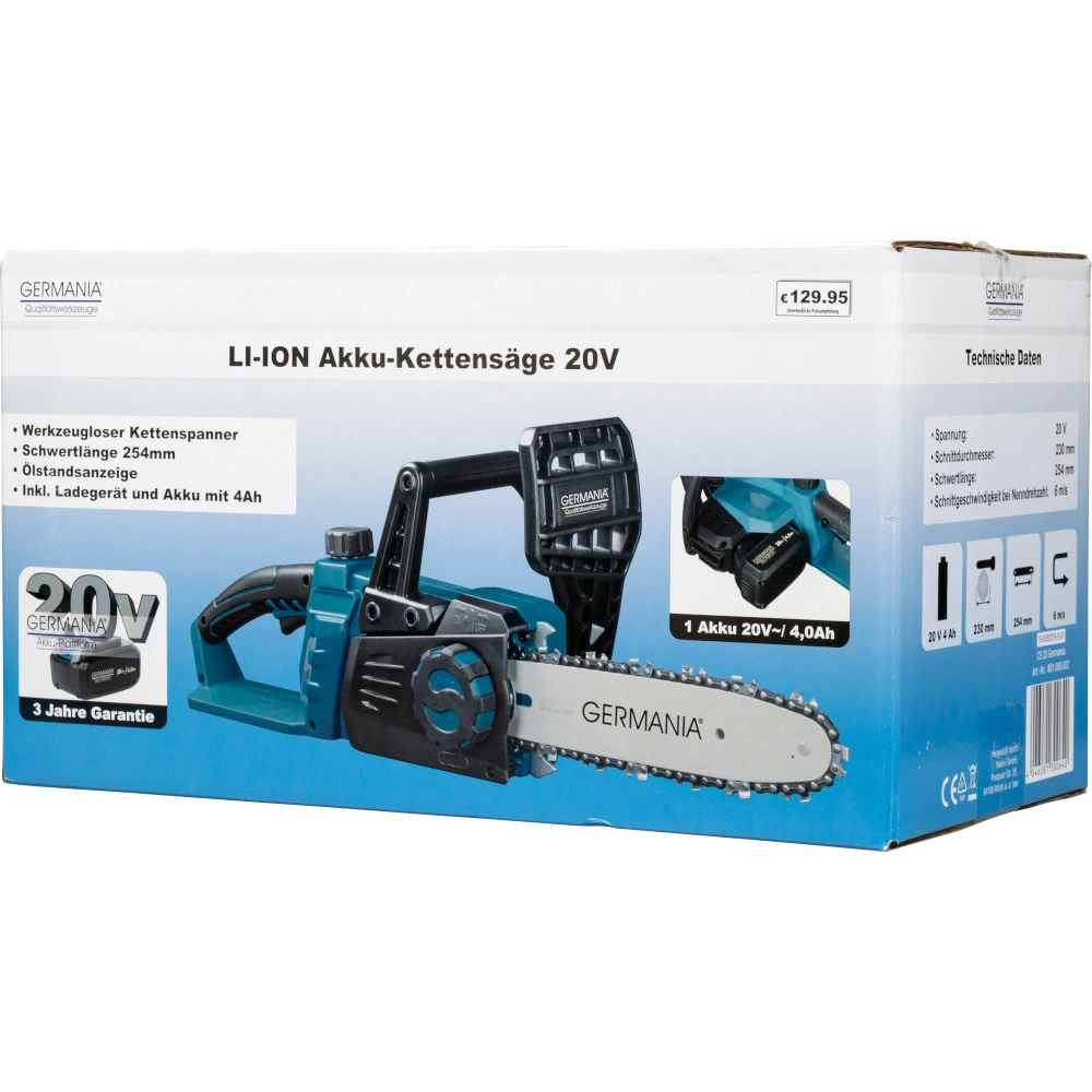 - Akku-Kettensäge 20 V von der Marke GERMANIA