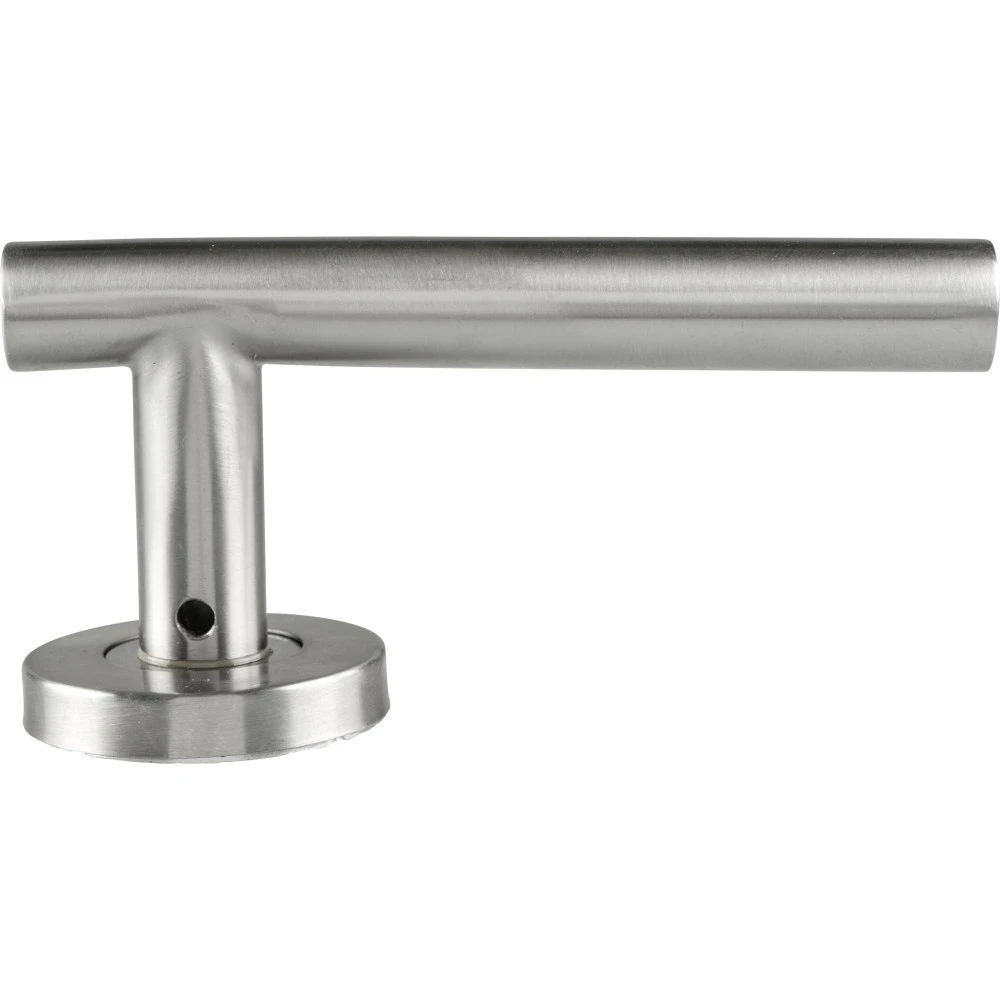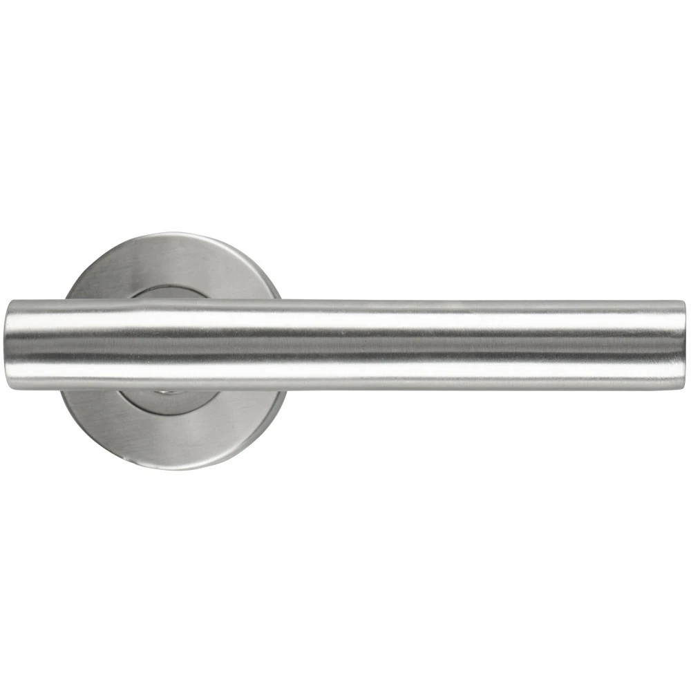 Zimmertür Drückergarnitur aus Edelstahl mit Türgriff in L-Form und OB-Rosette (Ovalbart). Die Türklinke ist für fast alle handelsüblichen Standardtüren mit einer Türstärke von ca. 38 bis 50 mm geeignet. Die Lieferung der Rosettengarnitur erfolgt inklusive Montagematerial.