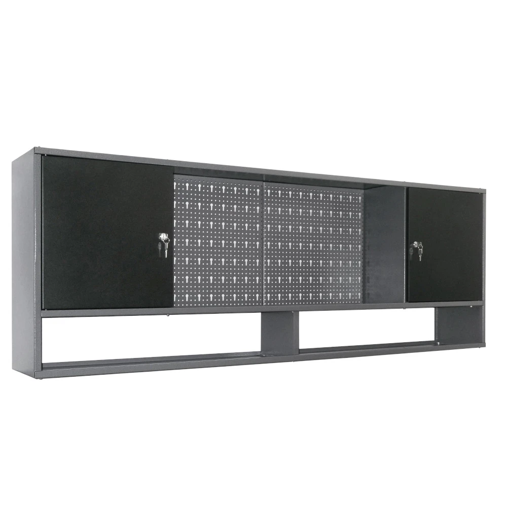 Werkzeug-Wandschrank 4-teilig aus Metall für alle, die ihre Werkzeuge in einer guten Ordnung halten wollen. Der Wandschrank ist geräumig und leicht an der Wand zu montieren. Der Werkzeugschrank besteht aus 4 Elementen – zwei verschließbare Teile und zwei offene Mittelteile mit Lochwand. Die Mittelteile sind mit zwei Metall-Regalböden ausgestattet, die in der Höhe variabel montierbar sind. An der Unterseite befindet sich eine Ablage für Sichtlagerkästen.